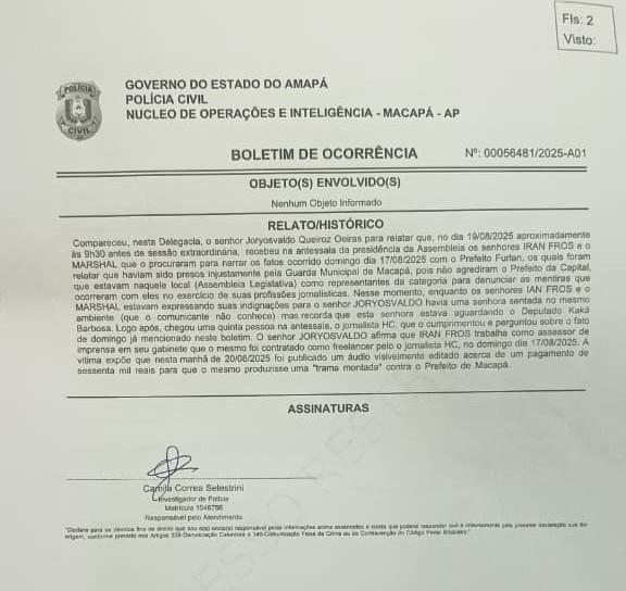 O deputado registrou um boletim de ocorrência na Delegacia de Policia Civil do Amapá, no núcleo de Operações e Inteligência, relatando que o jornalista Iran Froes e outro profissional, Marshal Vasconcelos, foram vítimas de agressão e que o vídeo divulgado seria uma trama montada contra ele. No documento, Oeiras reforça que não teve qualquer participação na ação, e que a divulgação do material configuraria crime de manipulação de informação. A denuncia será investigada por peritos da polícia, que buscarão identificar os responsáveis para esclarecer os fatos.