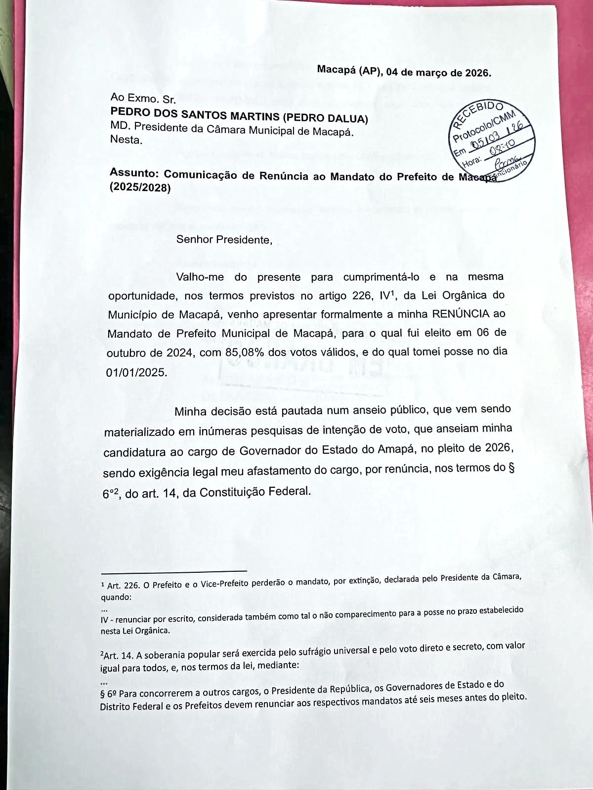 A renúncia foi formalizada por meio de um ofício encaminhado à Câmara Municipal. No documento, Furlan afirma que a decisão está ligada ao “anseio público” para que ele dispute o Governo do Amapá nas eleições de 2026, o que exige sua saída do cargo conforme a legislação eleitoral.