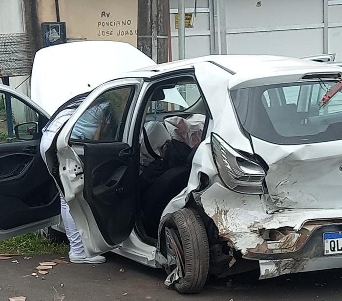 Com a força do impacto, o Ford Ka foi arrastado e acabou colidindo frontalmente contra um poste de energia elétrica. A condutora do veículo ficou desacordada em decorrência da colisão.