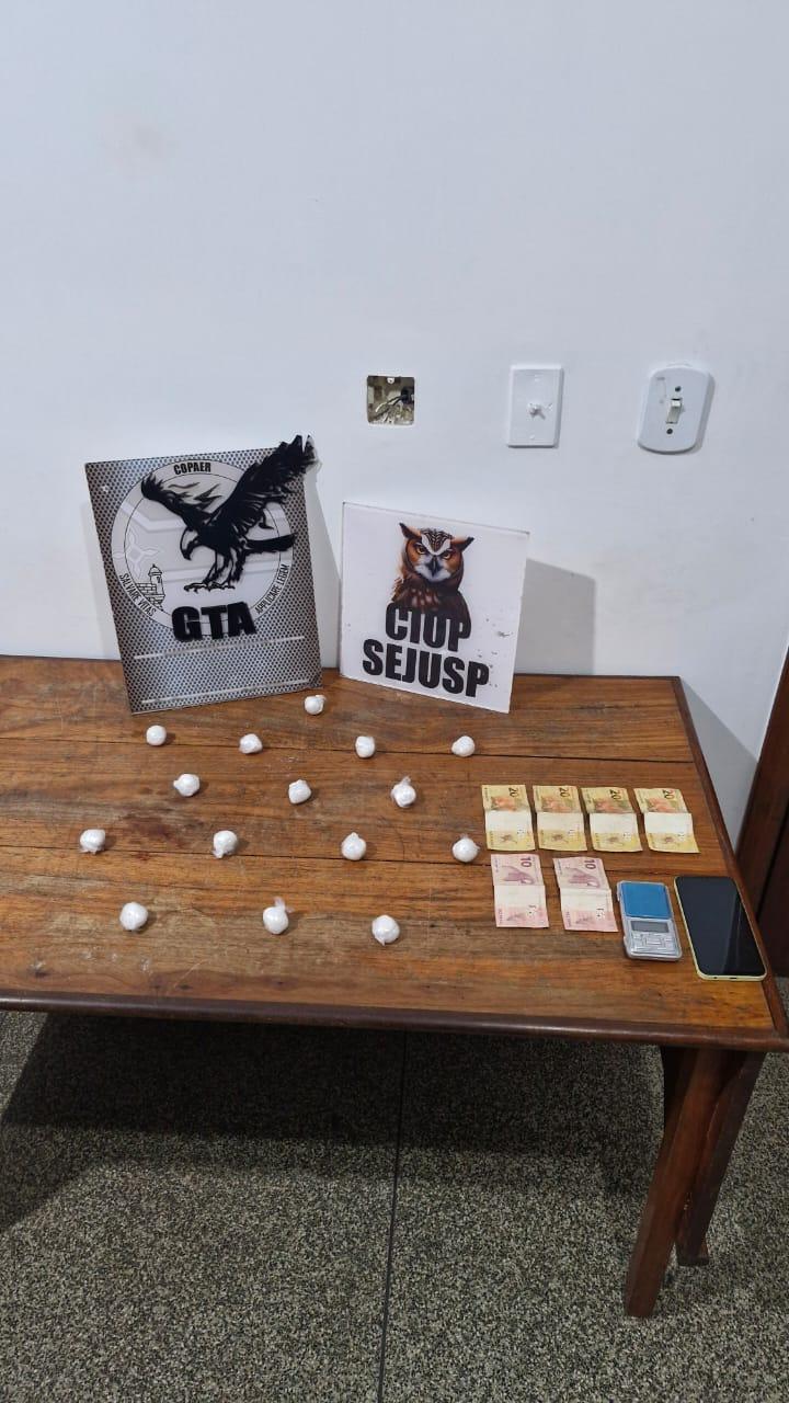 Durante a abordagem, os agentes encontraram 15 porções médias de substância supostamente cocaína, além de uma balança de precisão na cor prata, um aparelho celular Samsung de cor amarela e a quantia de R$ 100 em dinheiro, distribuída em quatro cédulas de R$ 20 e duas de R$ 10.