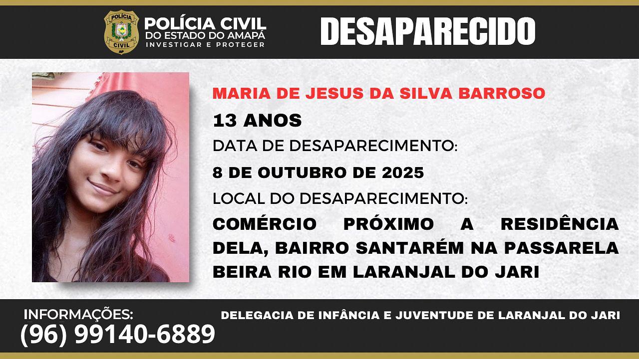A Polícia Civil do Amapá está pedindo o apoio da população para localizar Maria de Jesus da Silva Barroso, adolescente de 13 anos que desapareceu no último dia 8 de outubro de 2025, em Laranjal do Jari, sul do estado.