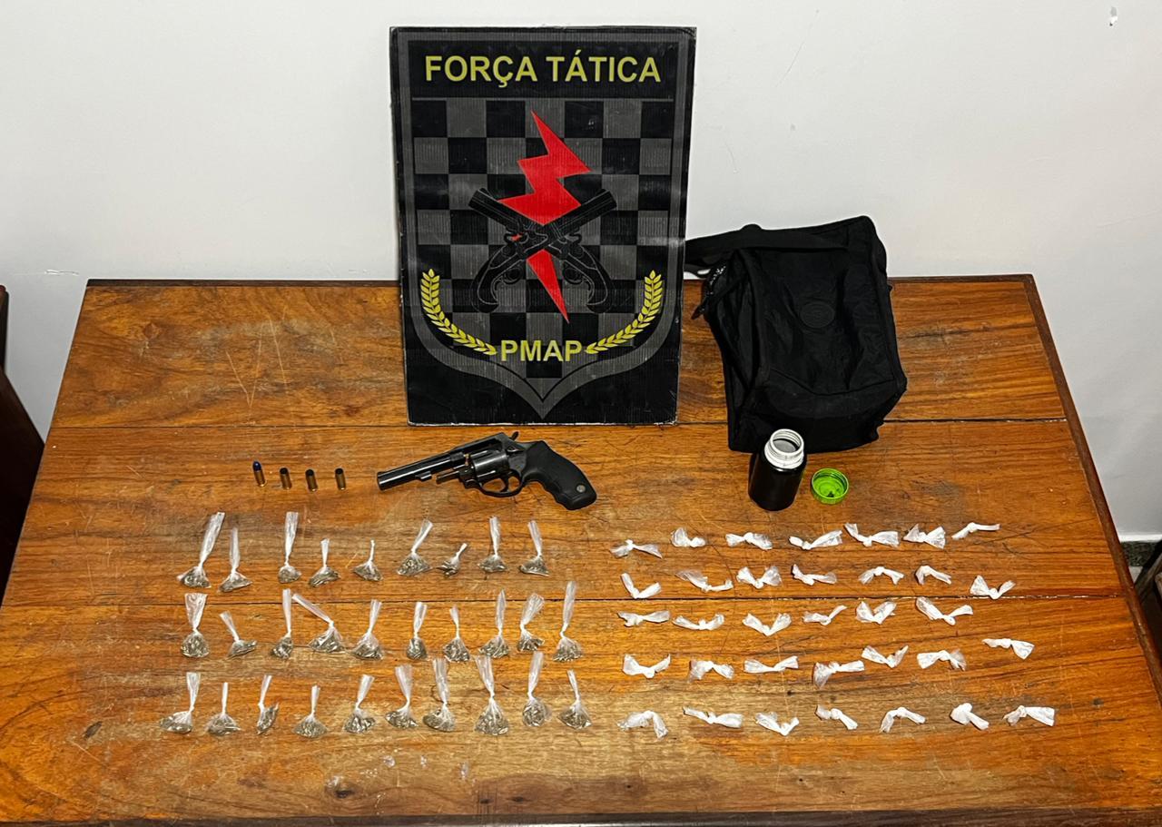 No local, os policiais apreenderam um revólver calibre 38 com numeração raspada, além de porções de substâncias entorpecentes, supostamente crack e maconha. Todo o material foi recolhido e apresentado no Ciosp do Pacoval, onde o caso foi registrado.